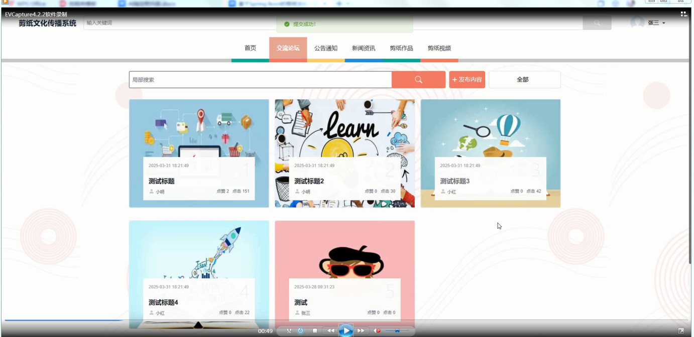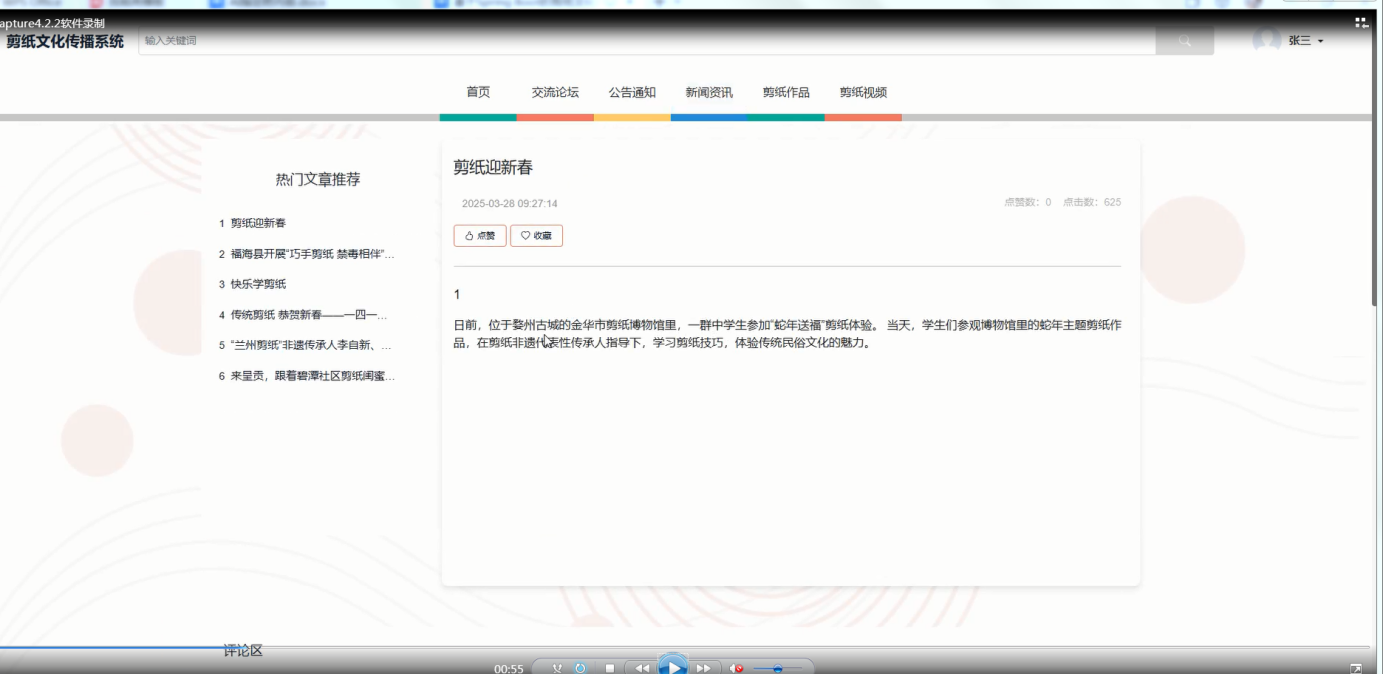 进入“剪纸视频”后,用户会看到所有剪纸视频列表。显示剪纸视频信息。用户点击剪纸视频后,将进入详细信息页面,用户可以点赞、收藏和评论。剪纸视频界面如下图所示。