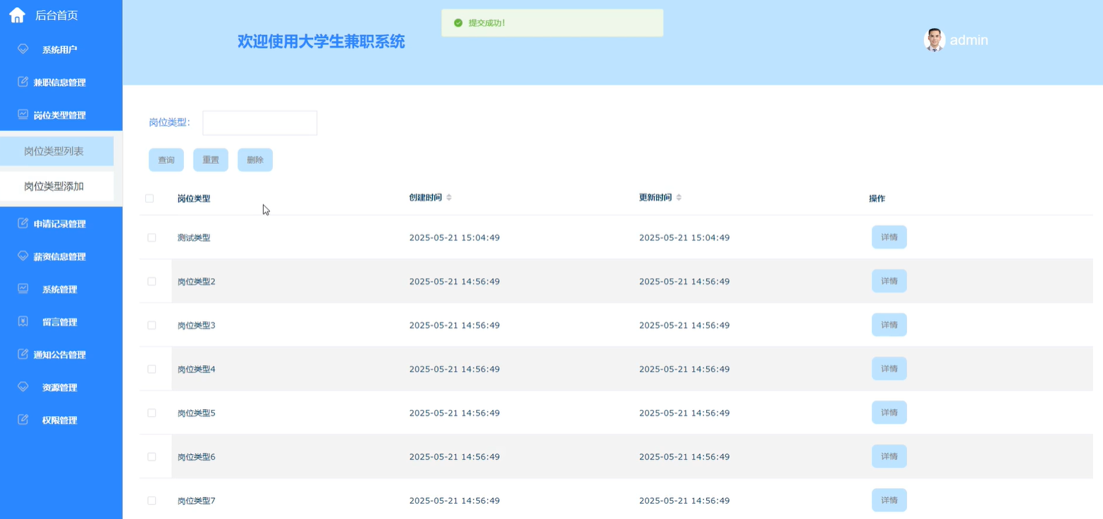 - 岗位类型管理:包含岗位类型列表和岗位类型添加功能。岗位类型列表:主要管理岗位类型,可进行增删改查等操作。岗位类型添加:可手动添加新的岗位类型。