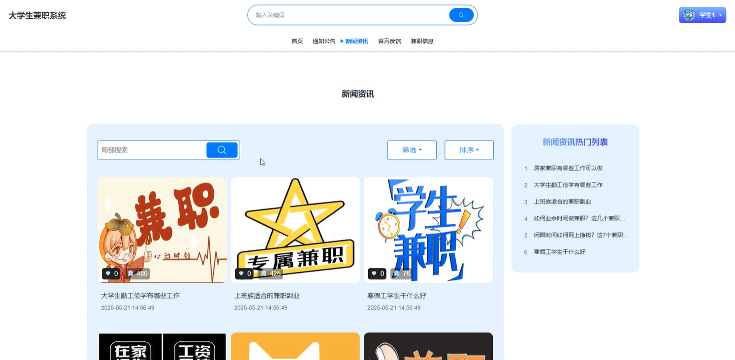 - 新闻资讯:主要展示后台发布有关兼职的新闻资讯信息。点击信息可点赞、收藏、发表评论等操作。