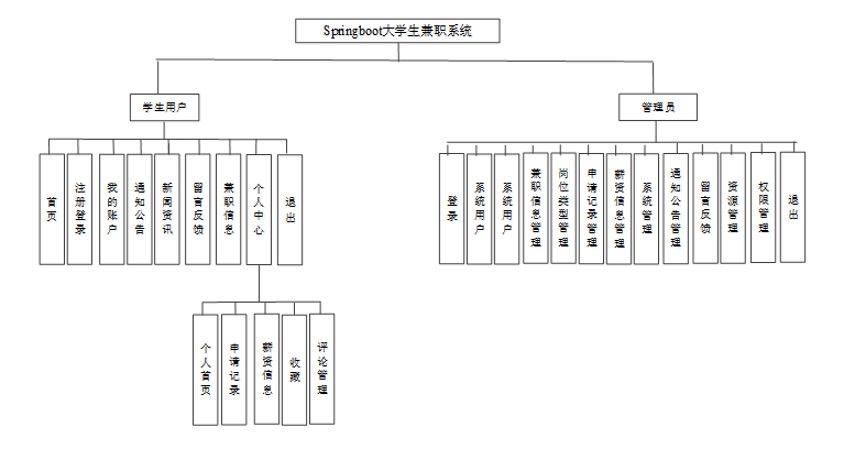 Springboot大学生兼职系统主要涉及有学生用户和管理二个角色,每个角色对应的功能模块如图4.1所示。