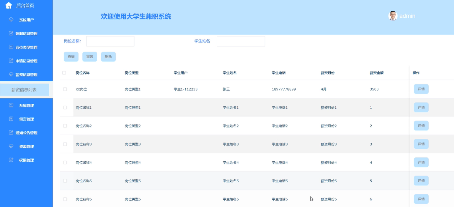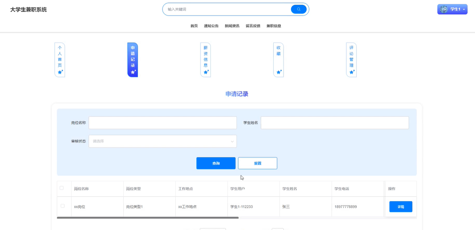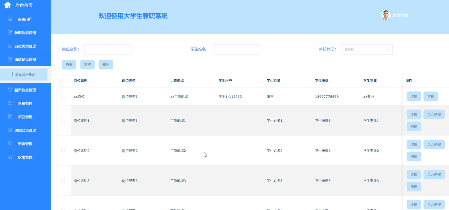 - 申请记录管理:管理员可查看并审核学生申请记录,处理通过后录入薪资信息,系统自动更新状态并通知学生审核结果。可进行查询、修改、删除等操作。