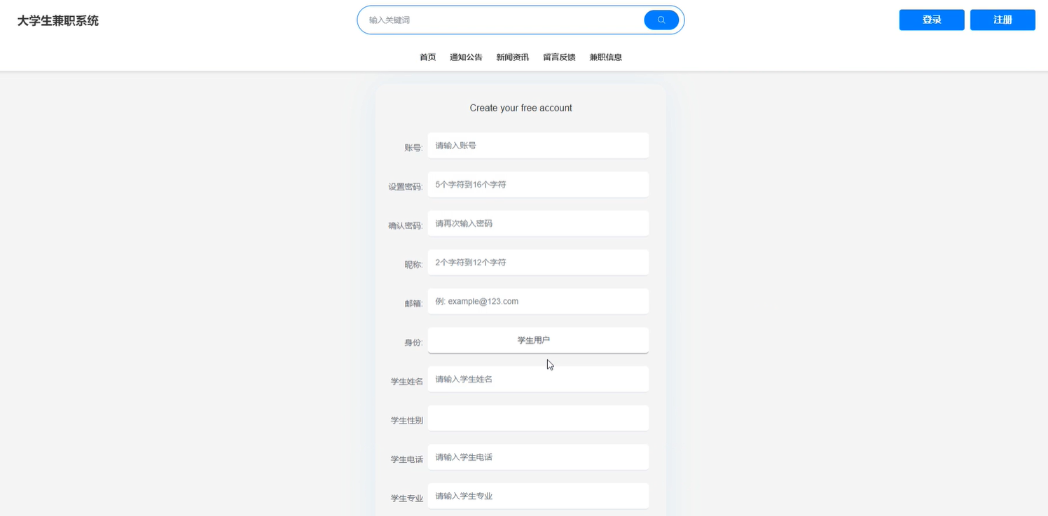 - 注册:点击注册,进入注册页面,填写相关账号、密码、确认密码、昵称、邮箱、学生姓名、学生性别、学生电话、学生专业、选择身份等字段信息,点击下方注册按钮,提示注册成功后,系统将自动跳转回到登录页面。