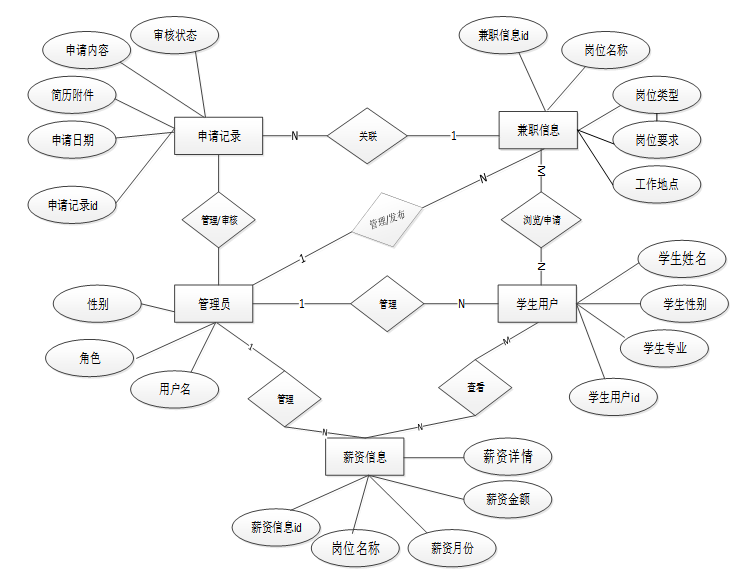Springboot大学生兼职系统中管理员、学生用户、兼职信息、 申请记录、薪资信息等E-R实体关系图