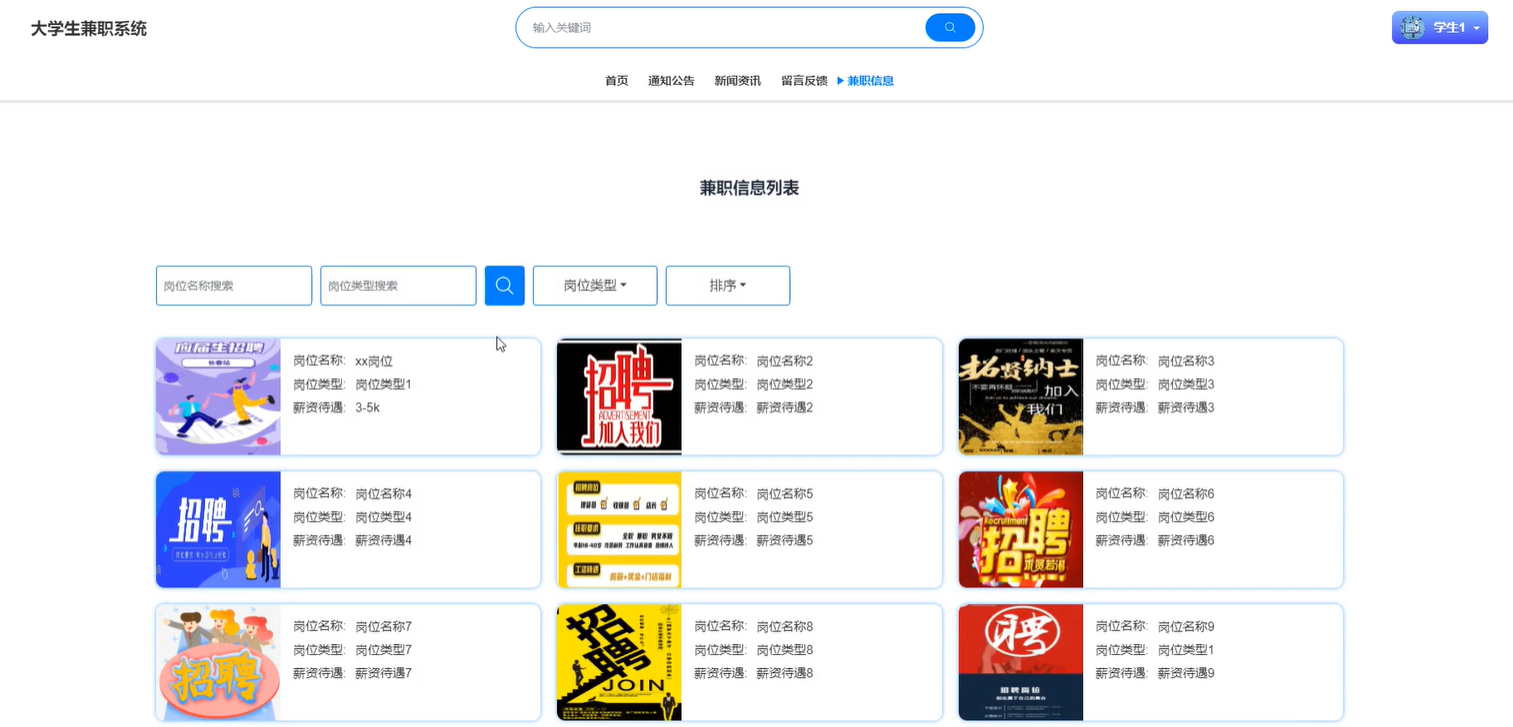- 兼职信息:展示后台发布的兼职信息,支持学生学生用户可浏览、搜索和筛选兼职信息,学生浏览到有感兴趣的兼职岗位,可申请,提交填写好申请资料等待管理员审核通过才能兼职。点击信息可发表评论、点赞、收藏等操作。