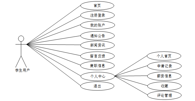 Springboot大学生兼职系统中学生用户包含注册登录、首页、我的账户、通知公告、新闻资讯、留言反馈、兼职信息、个人中心等功能。学生用户用例图如下所示: