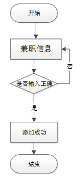 添加兼职信息,输入实岗位名称、岗位类型、岗位要求、薪资待遇,工作地点等并校验输入是否正确,兼职信息添加流程图,如图所示: