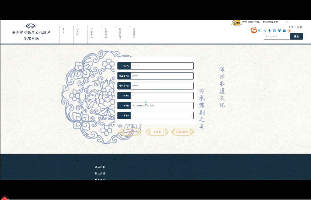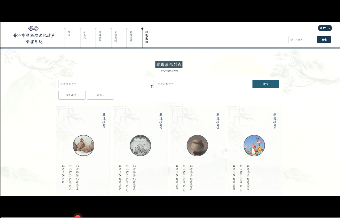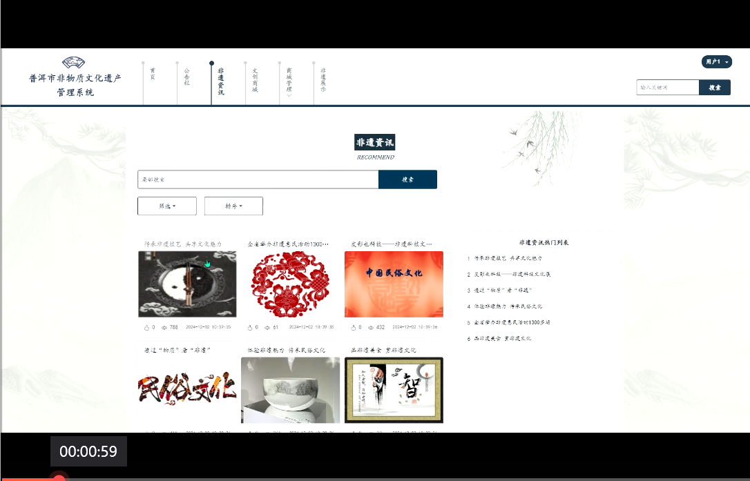本系统的建设有助于非物质文化遗产的保护和传承。通过数字化手段,可以对非物质文化遗产进行系统性的记录和保存,防止其因时间流逝而失传。同时,网站还提供了非遗项目的申报、审核和管理功能,支持各级文化部门和传承人进行有效的管理和保护工作。通过在线培训和教育模块,培养更多年轻的非遗传承人,确保这些文化遗产能够代代相传。