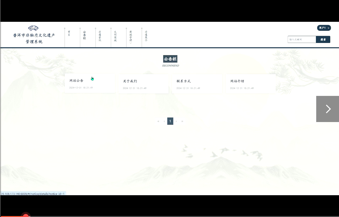 公告栏: 传承人用户可以看到系统上的网站公告、关于我们、联系方式、网站介绍。