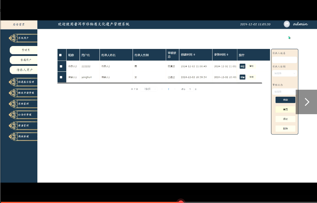 系统用户:管理员可以管理普通用户、传承人用户的账号信息。