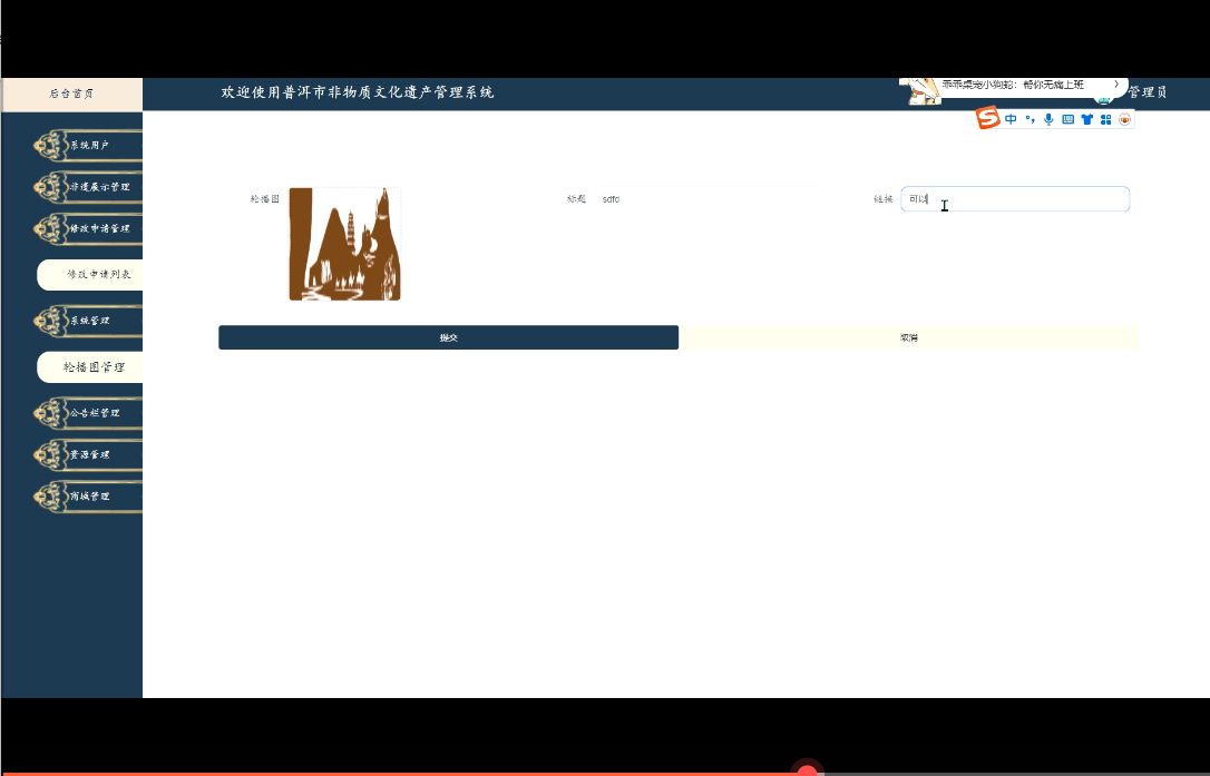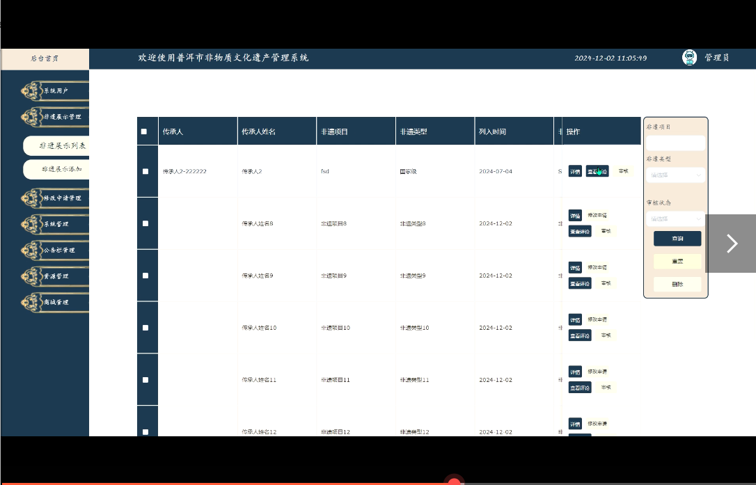 非遗展示管理:管理非遗展示列表内容,审核传承人提交的非遗展示项目,添加非遗展示项目。