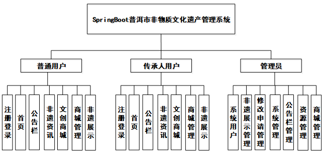 普洱市非物质文化遗产总体分为前台用户模块。每一个模块的功能都是根据先前完成的需求分析,并查阅相关资料后整理制作的。系统功能结构图如下图所示。