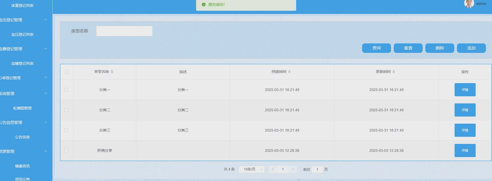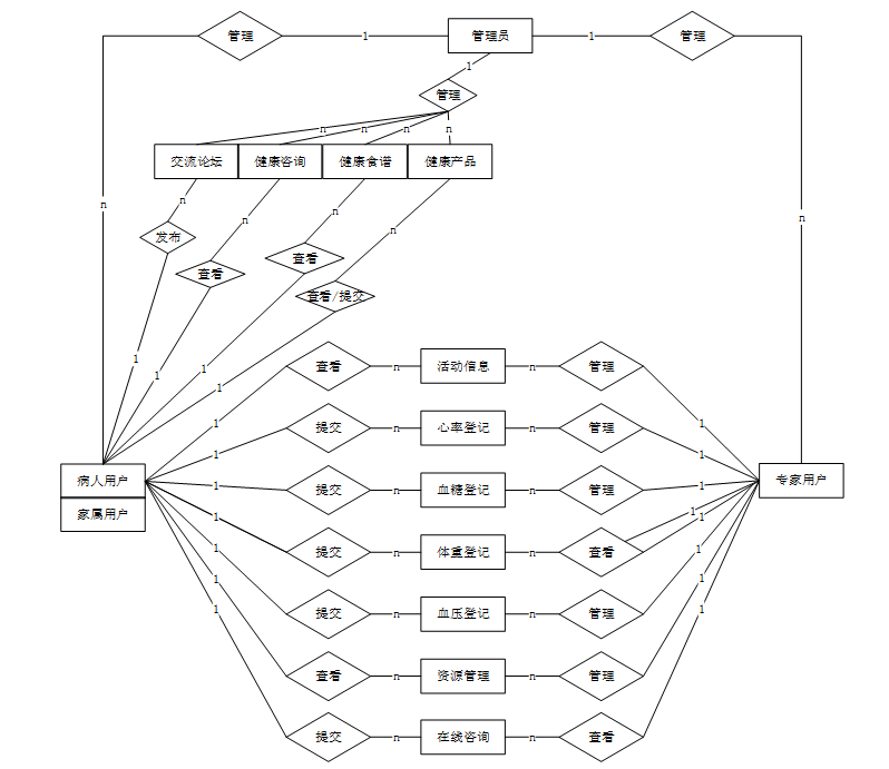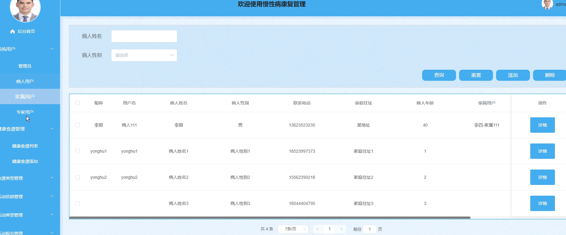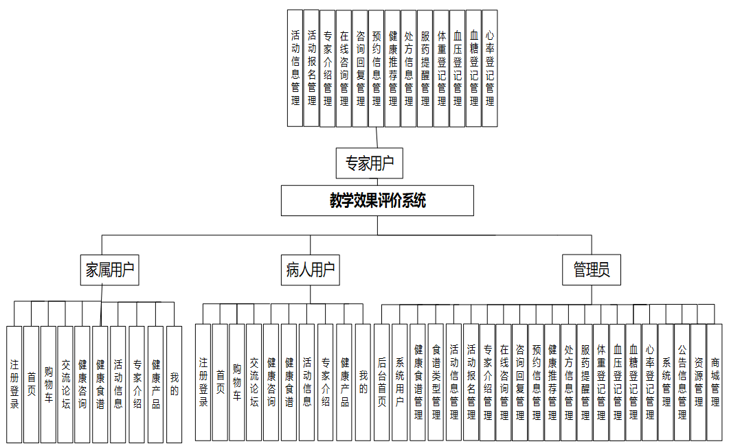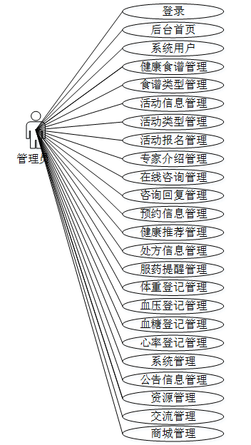 管理员可管理:后台首页、系统用户、健康食谱管理、食谱类型管理、活动信息管理、活动类型管理、活动报名管理、专家介绍管理、在线咨询管理、咨询回复管理、预约信息管理、健康推荐管理、处方信息管理、服药提醒管理、体重登记管理、血压登记管理、血糖登记管理、心率登记管理、系统管理、公告信息管理、资源管理、交流管理、商城管理等信息。