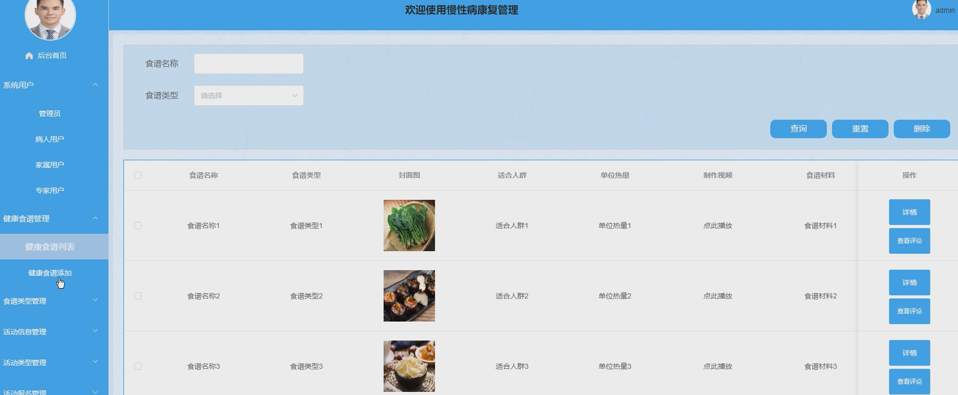 管理员可对健康食谱管理进行搜索、查看、添加、删除等操作。健康食谱管理界面如图5-11所示。