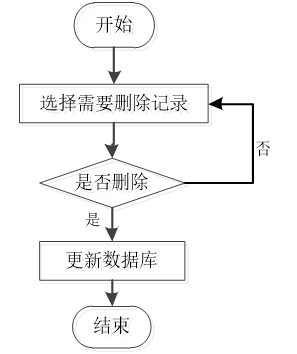 用户首先选择需要删除的记录,然后系统判断是否执行删除操作。如果用户选择不删除,则返回重新选择;如果选择删除,则更新数据库完成记录删除操作,最后结束流程。如图3-6所示。