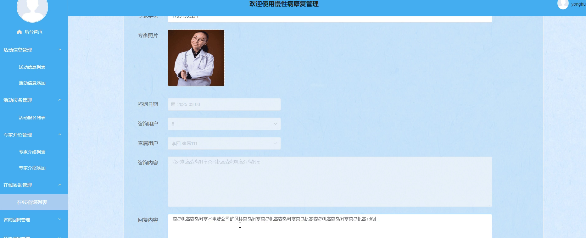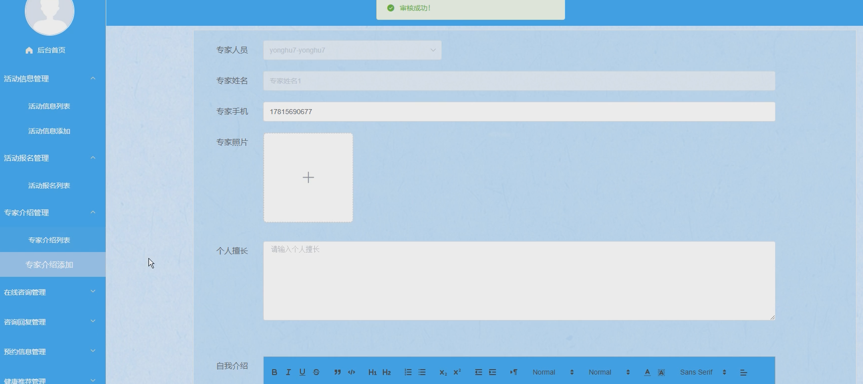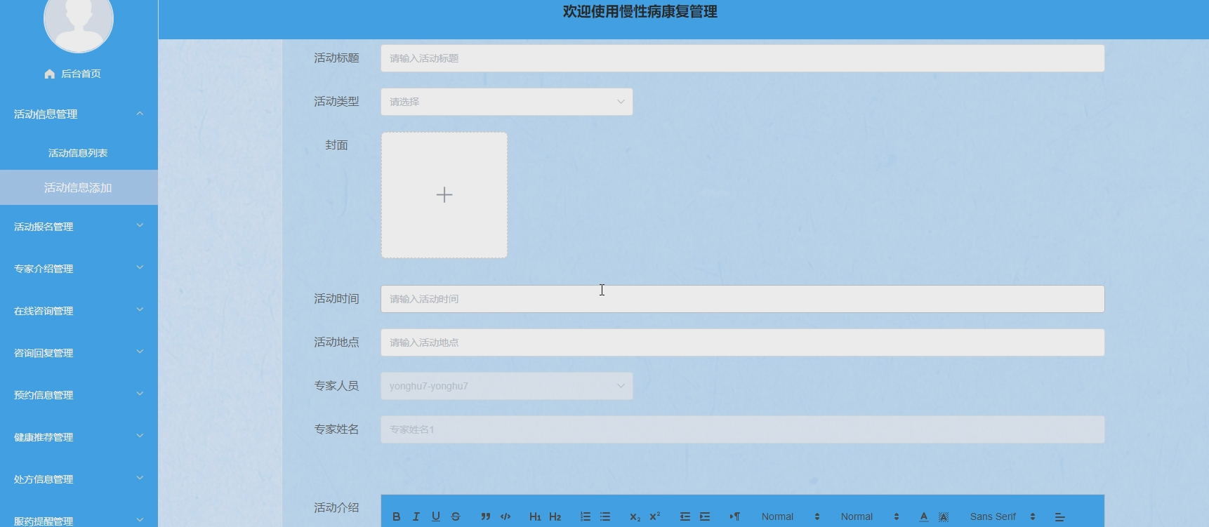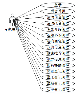 专家用户可管理:后后台首、活动信息管理、活动报名管理、专家介绍管理、在线咨询管理、咨询回复管理、预约信息管理、健康推荐管理、处方信息管理、服药提醒管理、体重登记管理、血压登记管理、血糖登记管理、心率登记管理。