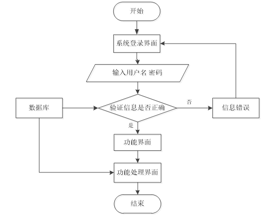 用户从“系统登录界面”开始,输入用户名和密码后,系统验证其信息是否正确。如果验证通过,则进入功能界面并进一步进入功能处理界面,最后流程结束;如果验证失败,则显示“信息错误”,用户需要重新输入。数据库支持验证过程。如图3-3所示。