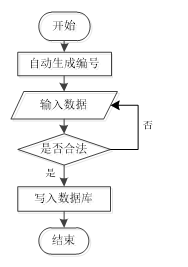 系统开始后自动生成编号,用户输入数据。系统判断输入的数据是否合法,若不合法则返回重新输入;若合法,则将数据写入数据库,最后结束流程。如图3-5所示。