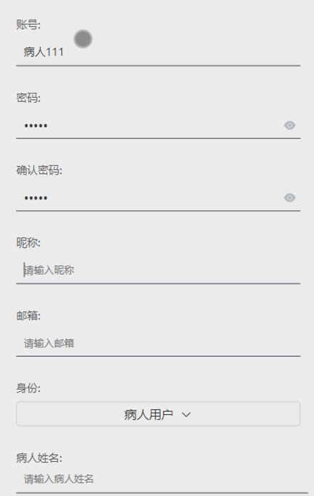 病人用户需通过注册功能创建个人账号,填写必要的个人信息(如用户名、密码、联系方式等),并完成邮箱或手机验证码验证。注册后,用户可以通过输入账号和密码进行登录,进入系统主页。注册登录如图5-1、5-2所示。