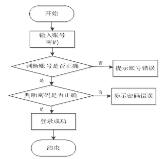 用户输入账号和密码后,系统首先判断账号是否正确,若不正确则提示“账号错误”;如果账号正确,则继续判断密码是否正确,若密码错误则提示“密码错误”;若账号和密码均正确,则显示“登录成功”,最后结束流程。如图3-4所示。