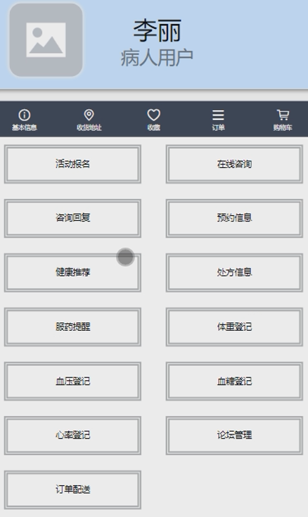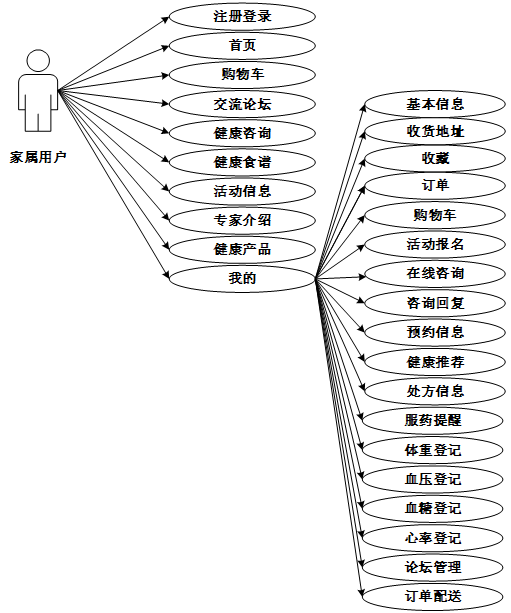 家属用户可进行注册登录、首页、购物车、交流论坛、健康资讯、健康食谱、活动信息、专家介绍、健康产品、我的(基本信息、收货地址、收藏、订单、购物车、活动报名、在线咨询、咨询回复、预约信息、健康推荐、处方信息、服药提醒、体重登记、血压登记、血糖登记、心率登记、论坛管理、订单配送)等信息。