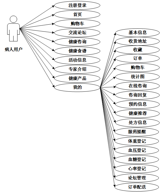 病人用户可进行注册登录、首页、购物车、交流论坛、健康资讯、健康食谱、活动信息、专家介绍、健康产品、我的(基本信息、收货地址、收藏、订单、购物车、统计图、在线咨询、咨询回复、预约信息、健康推荐、处方信息、服药提醒、体重登记、血压登记、血糖登记、心率登记、论坛管理、订单配送)等信息。病人用户用例图如图3-1所示。