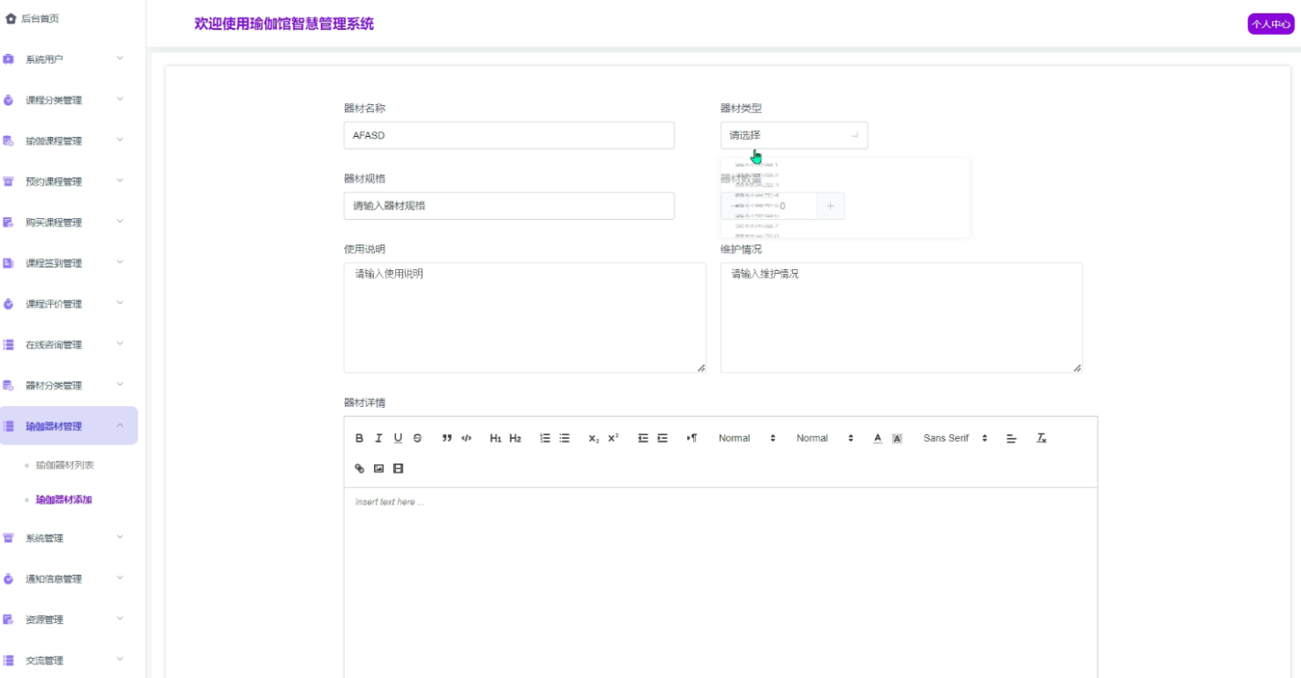 - 器材分类管理:管理员可以添加新的器材分类,删除不再使用的分类,以及查询现有分类的详细信息。这有助于对瑜伽器材进行有效分类和管理。