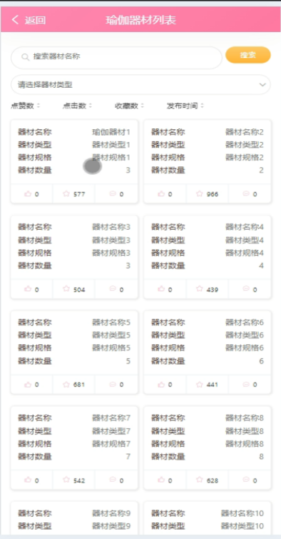 - 瑜伽器材:在瑜伽器材板块,用户可以查看各种瑜伽相关产品,如瑜伽垫、瑜伽衣等。用户可以对喜欢的器材点赞、收藏和评论。