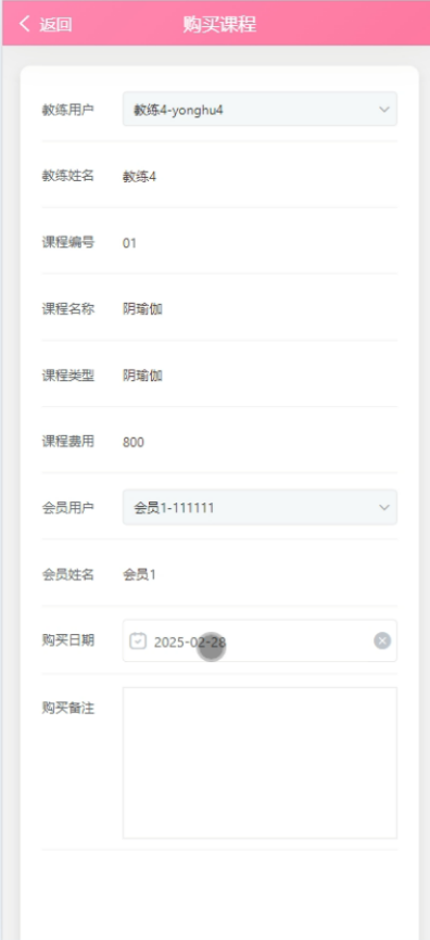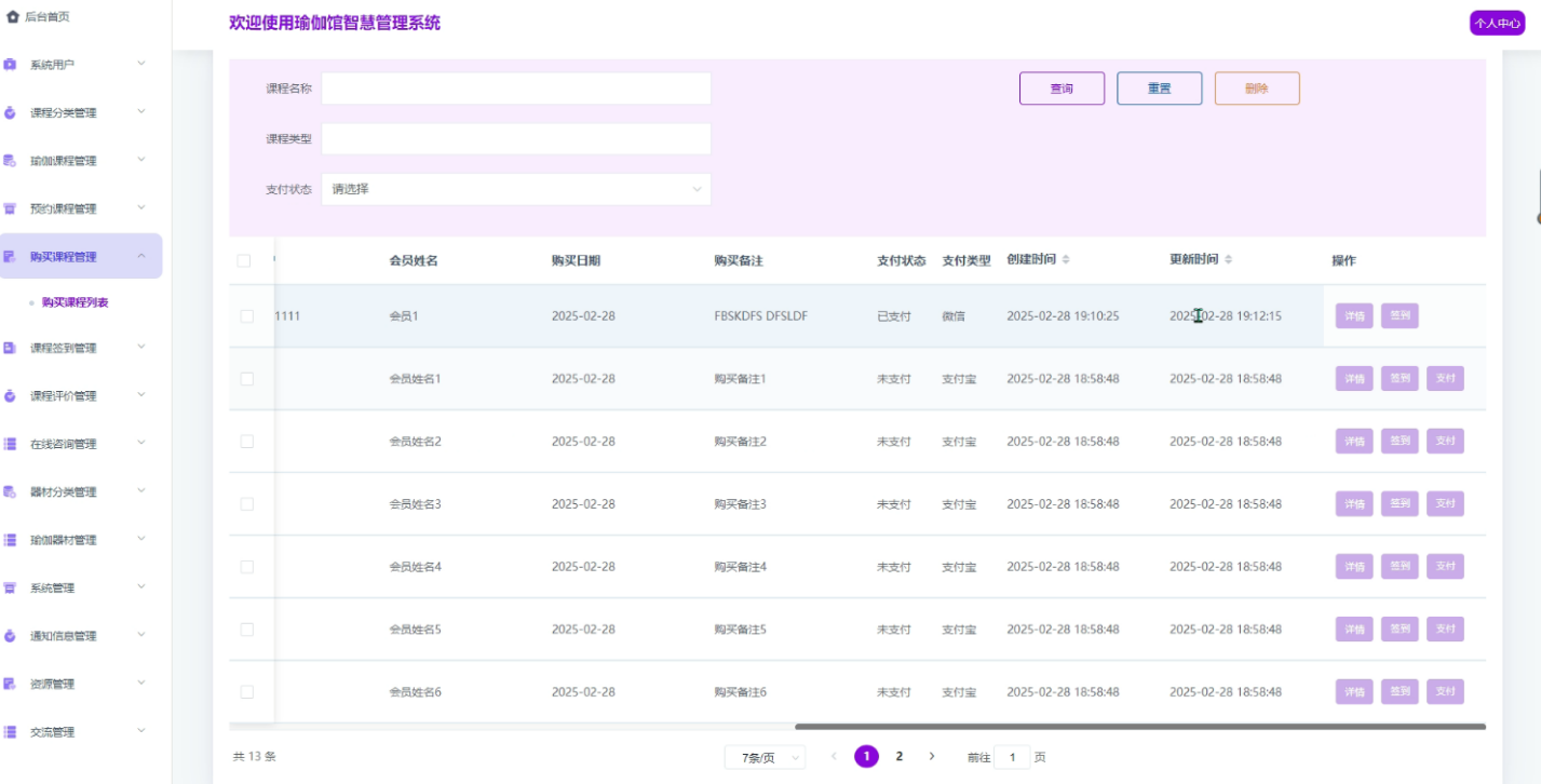 管理员可以删除错误的购买记录,查询会员购买的课程详情,管理签到记录以及处理支付事宜。这有助于跟踪会员的课程参与情况和财务状况。购买课程管理模块如下图所示。