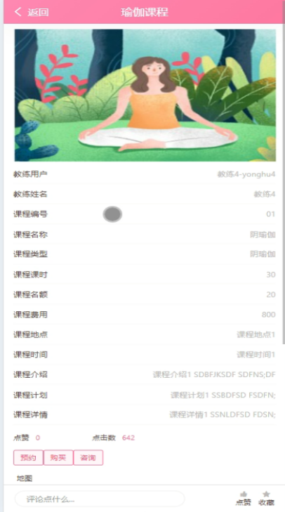 - 瑜伽课程:用户可以查看瑜伽课程安排,对课程进行点赞、收藏和评论,同时可以预约和签到参加课程。