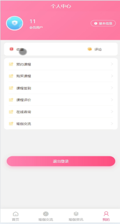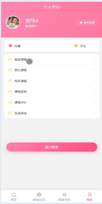 - 我的:用户个人中心,可以添加瑜伽课程,审核和预约课程,购买课程,进行课程签到,对课程进行评价,进行回复在线咨询,以及参与瑜伽交流社区。
