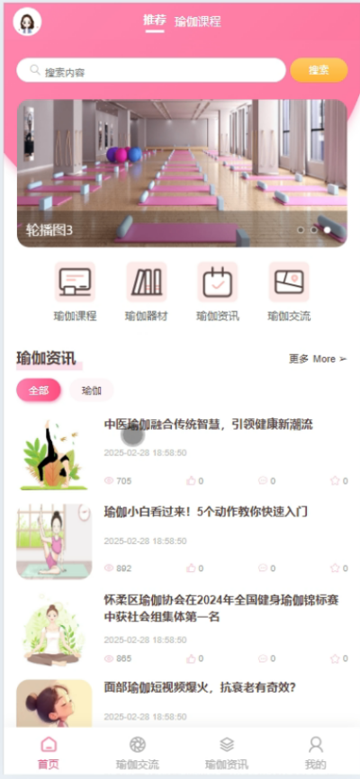 - 首页:展示瑜伽相关的综合信息,包括瑜伽资讯、课程、器材介绍以及瑜伽交流社区,为用户提供一站式瑜伽学习和交流平台。