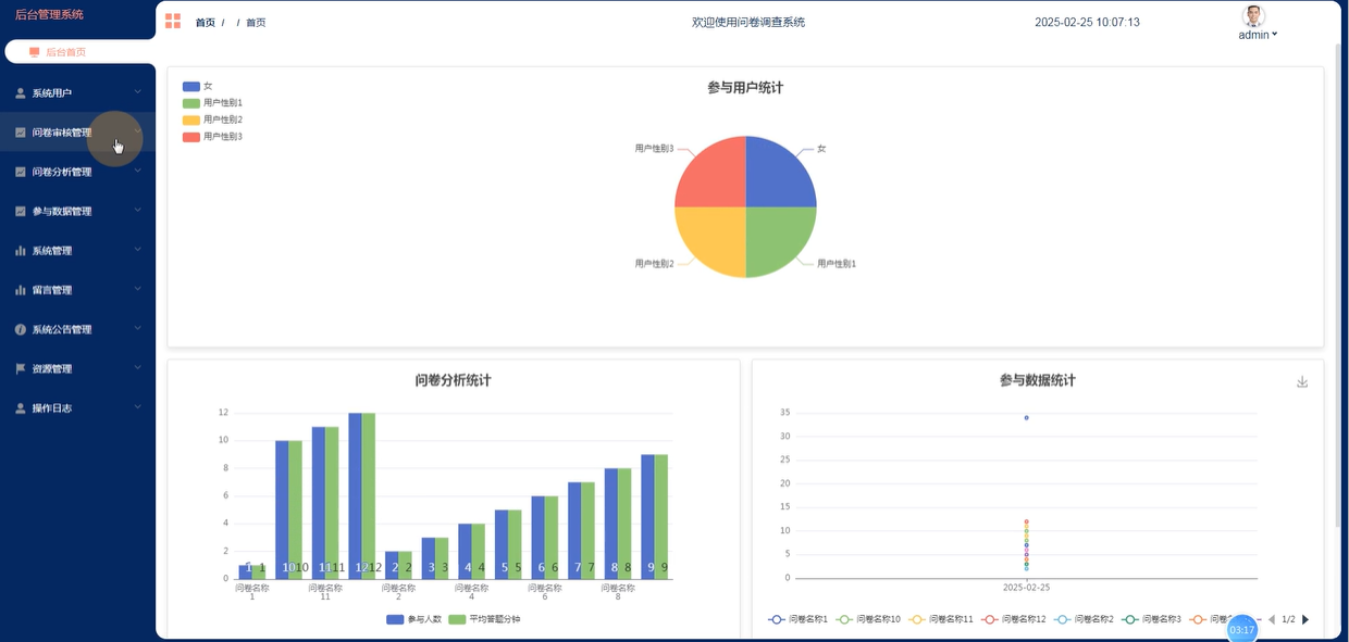 后台首页:管理员可以在后台首页查看参与用户统计数据(以圆图形式呈现)、问卷分析统计、参与数据统计(折线图展示)等,帮助管理员实时了解系统运行情况和用户参与度。管理员还可以修改个人资料和登录信息。