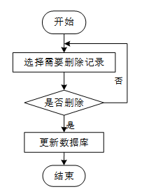 用户选择需要删除的记录后,系统判断是否确认删除。若未确认,返回选择环节,若确认删除,则更新数据库,删除对应记录,完成操作后流程结束。删除信息流程图如下图所示。