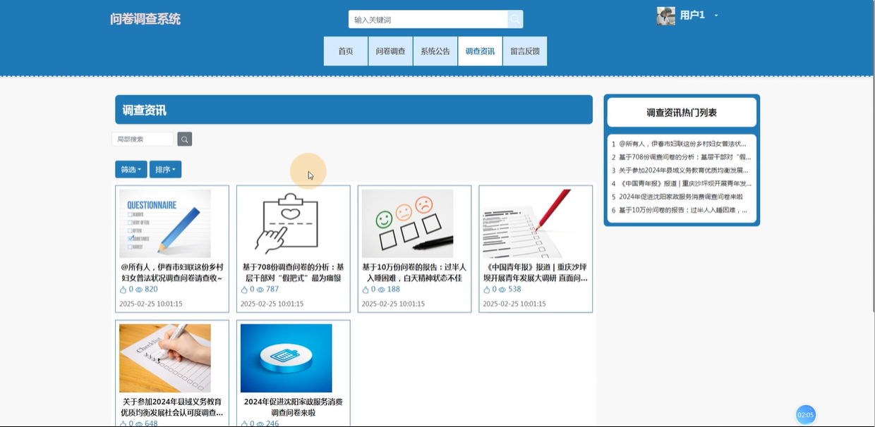 调查资讯:参与用户能够查看调查相关的详细信息,并根据兴趣查看推荐的热门文章。用户可以搜索资讯、对资讯进行点赞、收藏、评论以及删除操作,增强了平台的互动性和参与感。