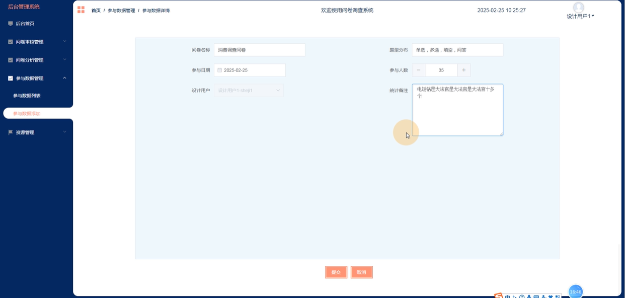 系统用户管理:管理员能够管理系统内所有用户,包括管理员、参与用户和设计用户。可以对这些用户进行增、删、改、查等操作,查看详细信息,确保系统用户管理的清晰和有序。