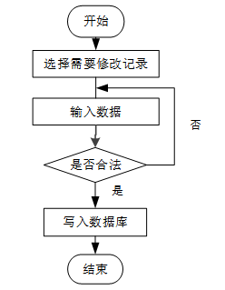 用户首先选择需要修改的记录,输入修改后的数据,系统判断输入数据是否合法。若数据不合法,提示重新输入,若数据合法,则将修改后的数据写入数据库,完成操作后流程结束。修改信息流程图如下图所示。