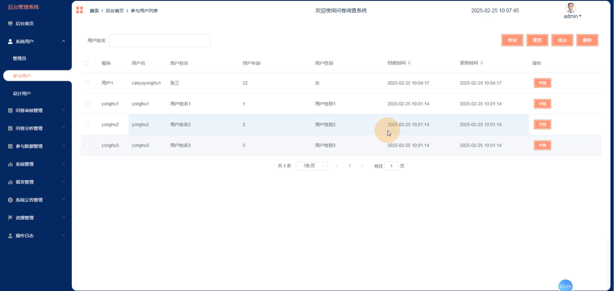 参与数据管理:管理员能够查看参与用户的数据,进行数据添加、搜索、查询、重置、删除等操作,确保参与数据的准确性和完整性。
