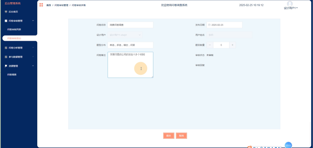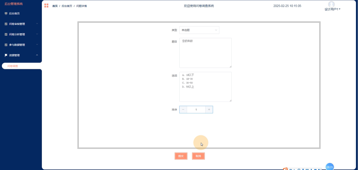 资源管理:设计用户能够管理平台上的问卷调查资源,包括题库的编辑、增加和删除题目。设计用户还可以设置问卷的状态和进行点评,确保问卷设计的有效性和完整性。