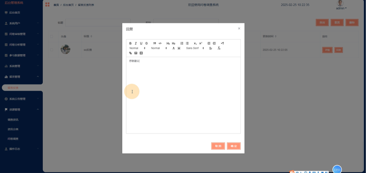 留言管理:管理员可以查看留言反馈的详细信息,并对留言进行回复,支持查询、搜索、删除等操作,及时回应用户的问题和建议。