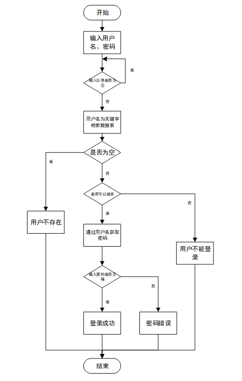 用户输入用户名和密码后,系统先检查输入是否为空,再验证用户名是否存在,若存在则通过用户名获取密码并校验。若密码正确则登录成功,否则提示密码错误。若用户名不存在或无法登录,提示用户操作无效。如下图所示。