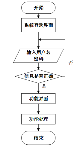 用户首先进入系统登录界面,输入用户名和密码后,系统验证信息是否正确。若验证失败,返回登录界面重新输入,若验证成功,则进入功能界面,执行相应功能处理后结束操作流程。操作流程如下图所示。