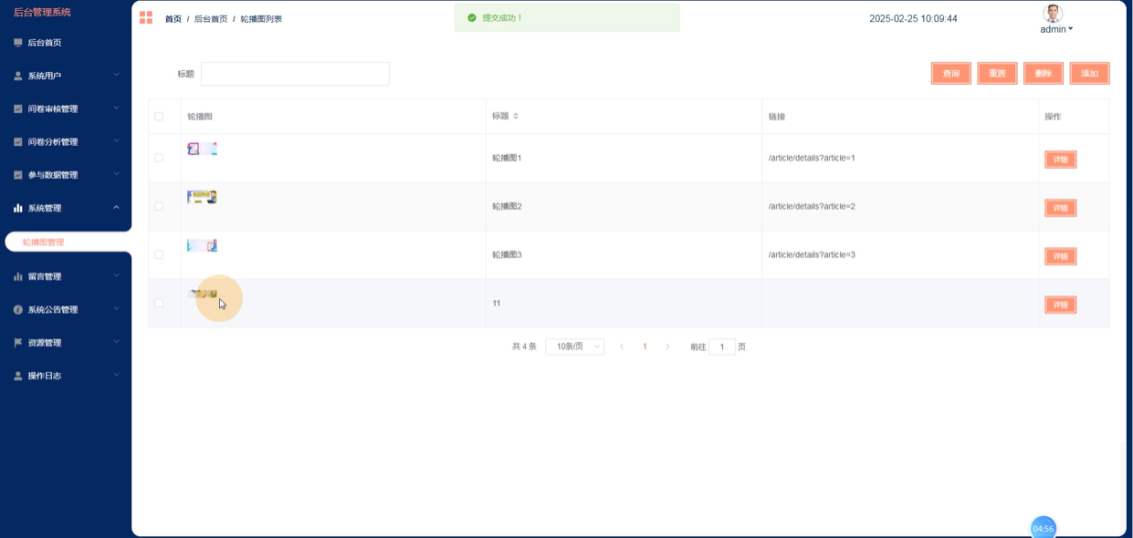 系统管理:管理员可以管理系统中的轮播图,执行增、删、改、查等操作,确保平台展示的内容及时更新。