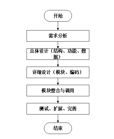系统开发流程的主要步骤,从需求分析到系统完成的全过程。流程包括需求分析、总体设计(结构、功能、数据)、详细设计(模块、编码)、模块整合与调用,以及测试、扩展和完善,最终完成系统的开发。本系统的开发流程如下图所示
