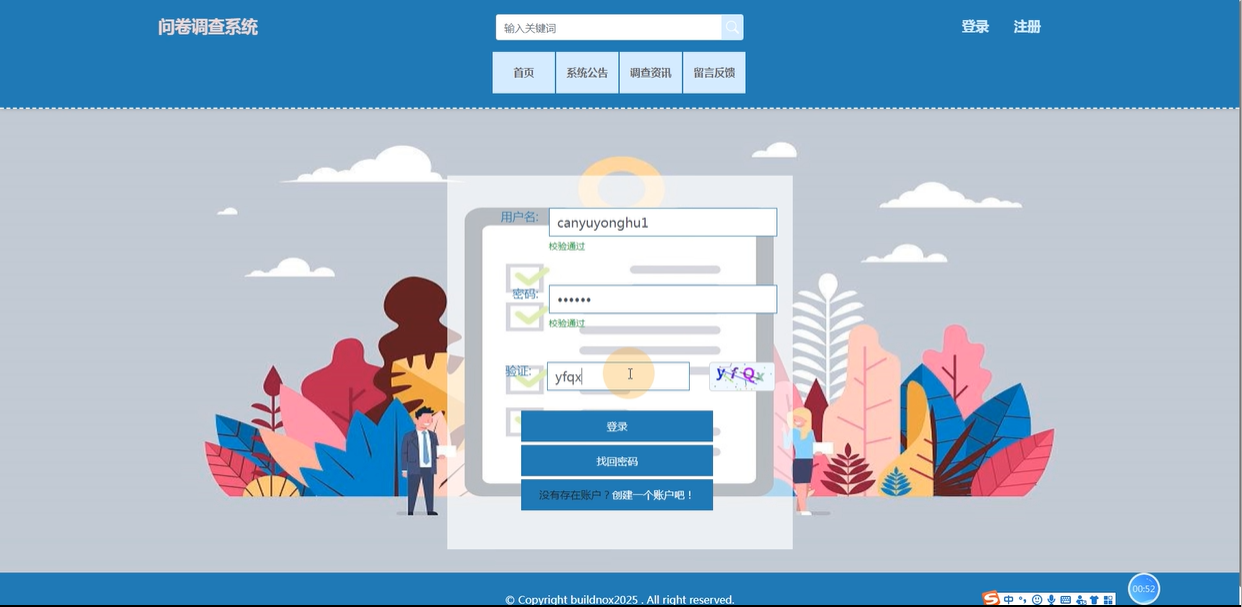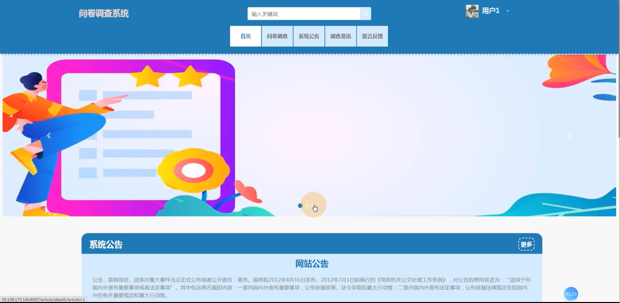 首页:参与用户在首页可以看到轮播图、导航栏、系统公告、推荐调查资讯等内容,方便用户了解平台的最新动态与信息。首页是参与用户进入系统的主界面,提供快捷的导航与操作入口。