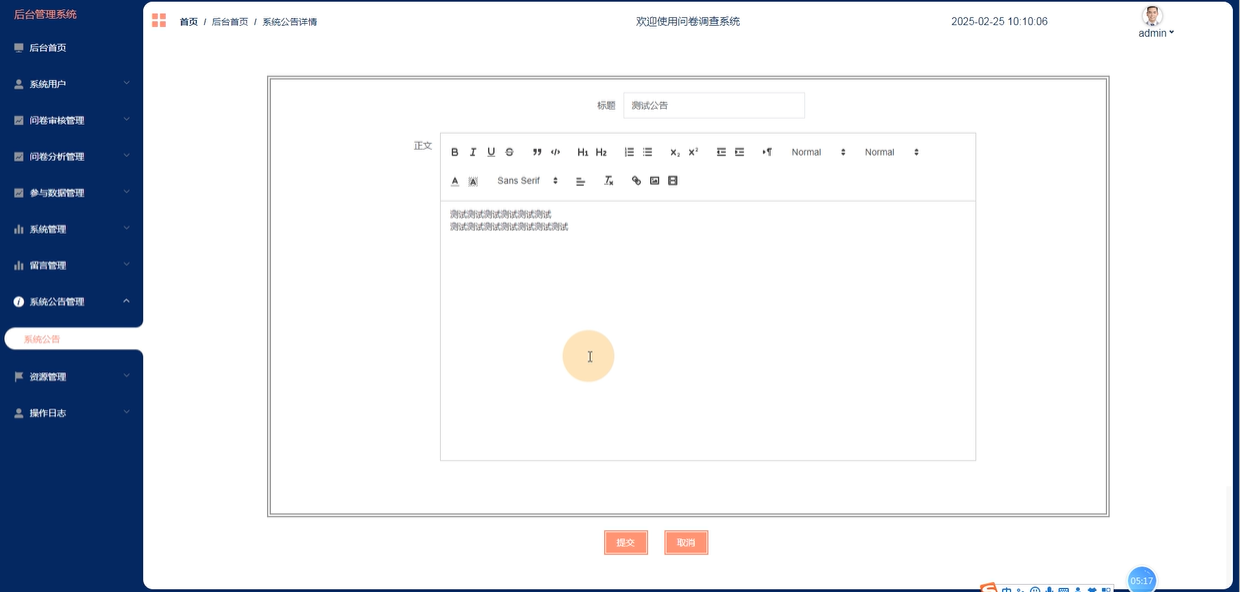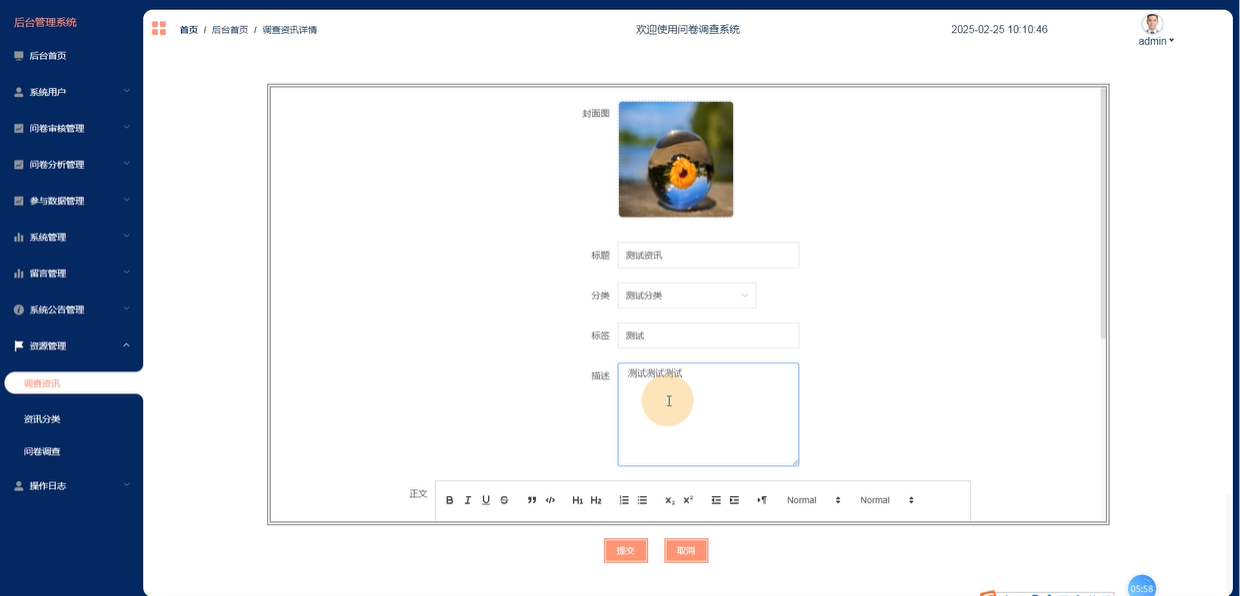 资源管理:管理员能够管理调查资讯和问卷调查,包括查看详情、搜索、增删改查资讯,管理资讯分类和题库,并能够进行答题、点评等操作。