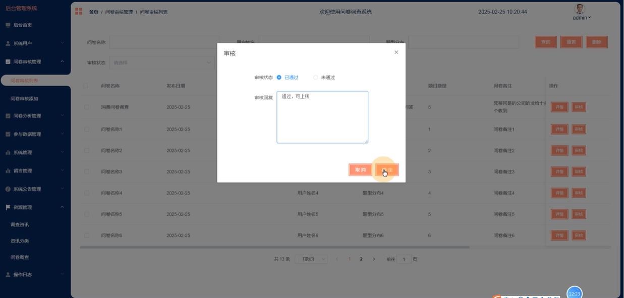 问卷审核管理:管理员可以查看问卷的详细内容并进行审核操作。管理员支持对问卷的状态进行查询、搜索、重置、删除等操作,确保问卷内容的合规性和有效性。