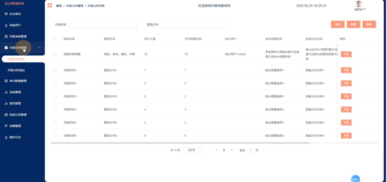 问卷分析管理:管理员可以管理问卷分析相关的内容,包括查看分析结果、添加新的分析数据、进行搜索和查询等操作,帮助更好地理解问卷的反馈结果。