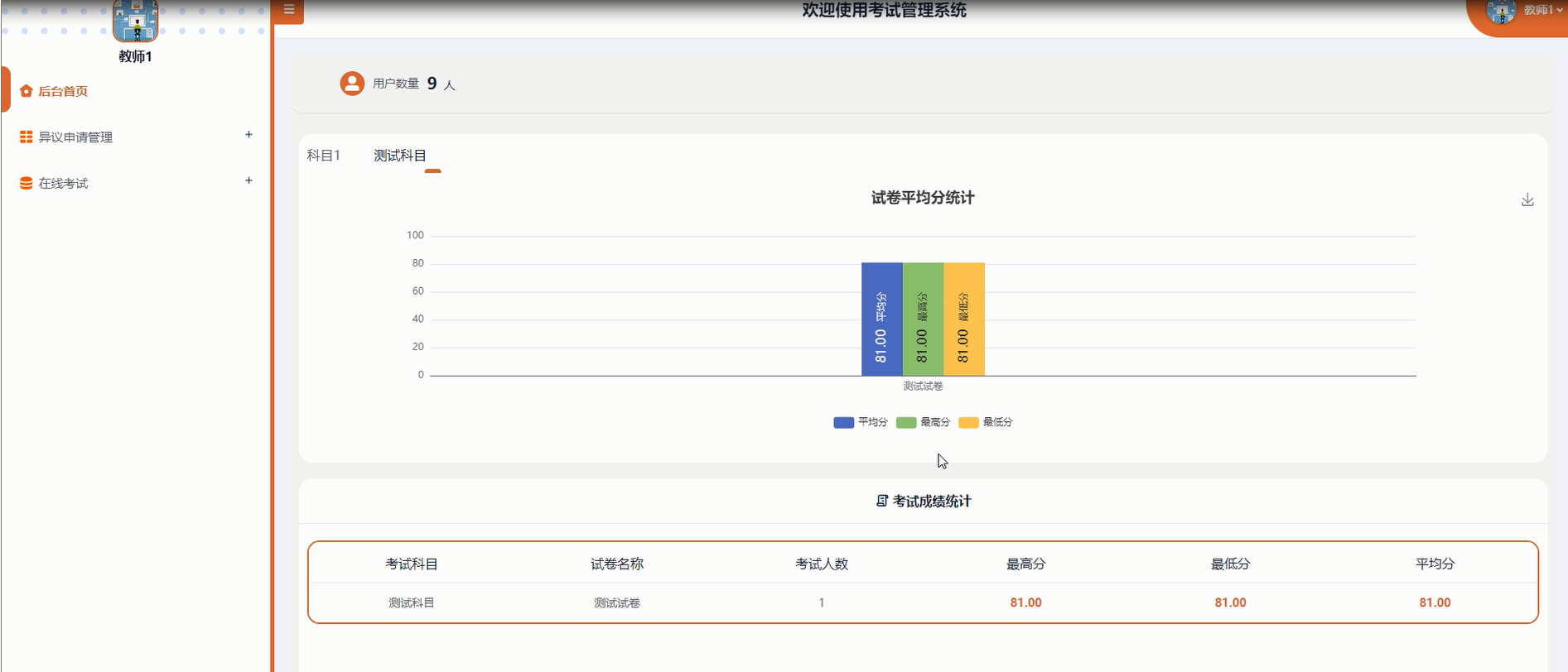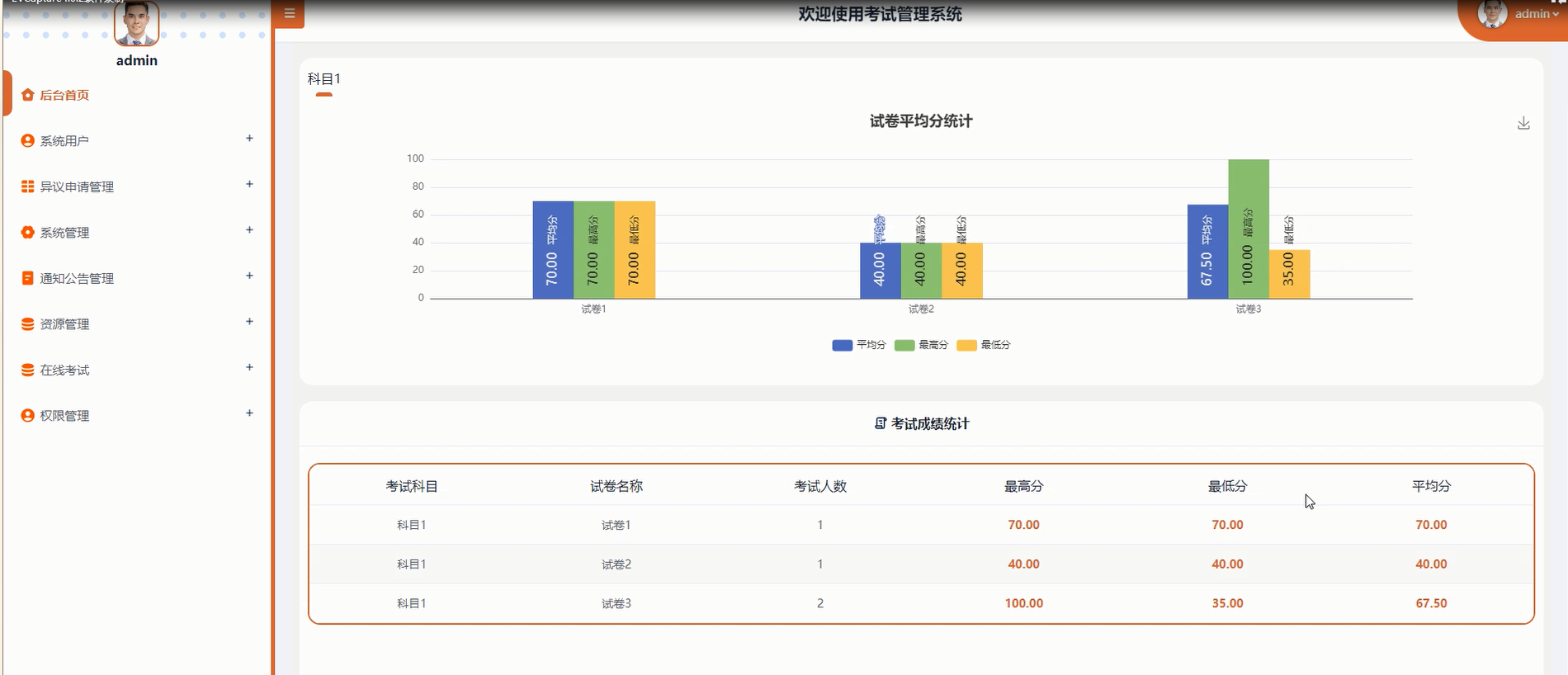 后台首页:提供直观的数据统计视图,包括考试科目试卷平均分统计图表、考试成绩统计表,帮助教师快速了解教学效果。