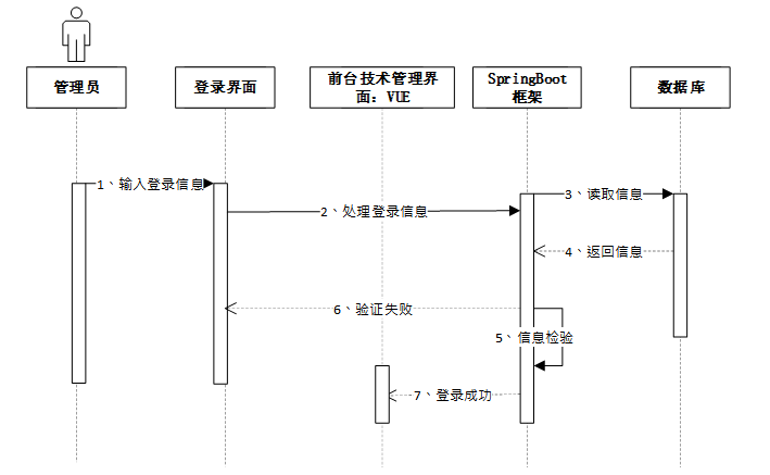 管理员输入登录信息后,登录界面将信息传递至前台管理界面,随后通过SpringBoot框架读取数据库中的用户信息并返回。系统验证信息,若验证成功则登录成功,若验证失败则返回错误提示。登录时序图如图4-4所示。