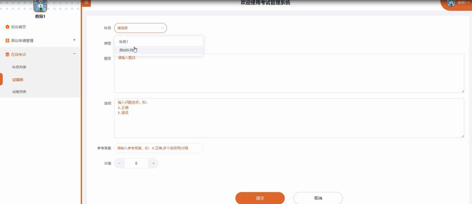 | 题库管理功能测试 | 教师添加一道单选题,包括题目内容、选项、答案、分值 | 无 | 符合预期 |
